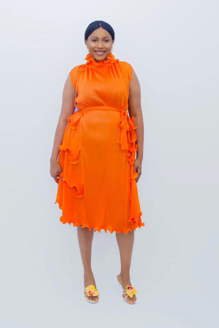 High-Neck Sleeveless Midi Dress with Side Ruffles